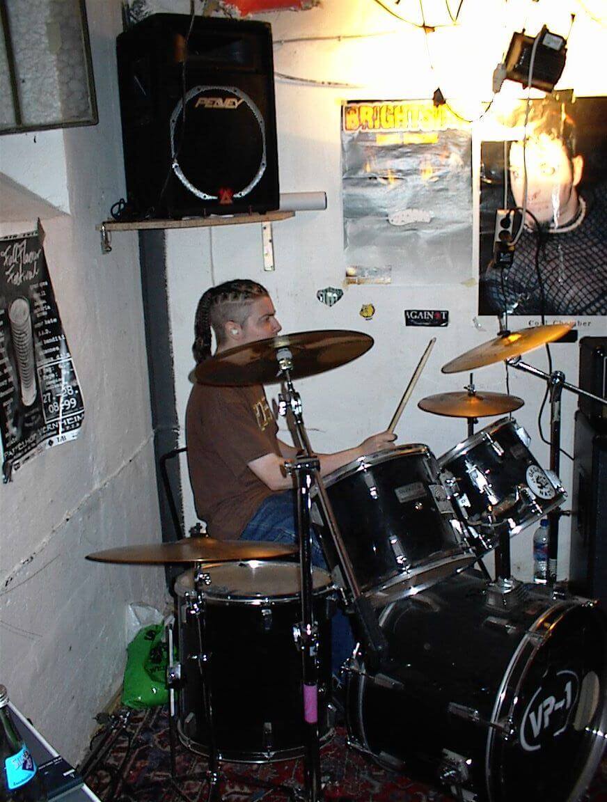 Wir starteten auf Deutsch mit Till als Sänger, der heute erfolgreich bei Saltatio Mortis Gitarre spielt. Wir hielten das für interessant, aber im Nachhinein war es dann doch eine Spur zu klamaukig und nicht das Wahre. Und spaßig ist es auch nicht immer, mit Schminke und Pink/Blau in irgend nem JUZ Katzenklapprich als Schwuchtel beschimpft zu werden.